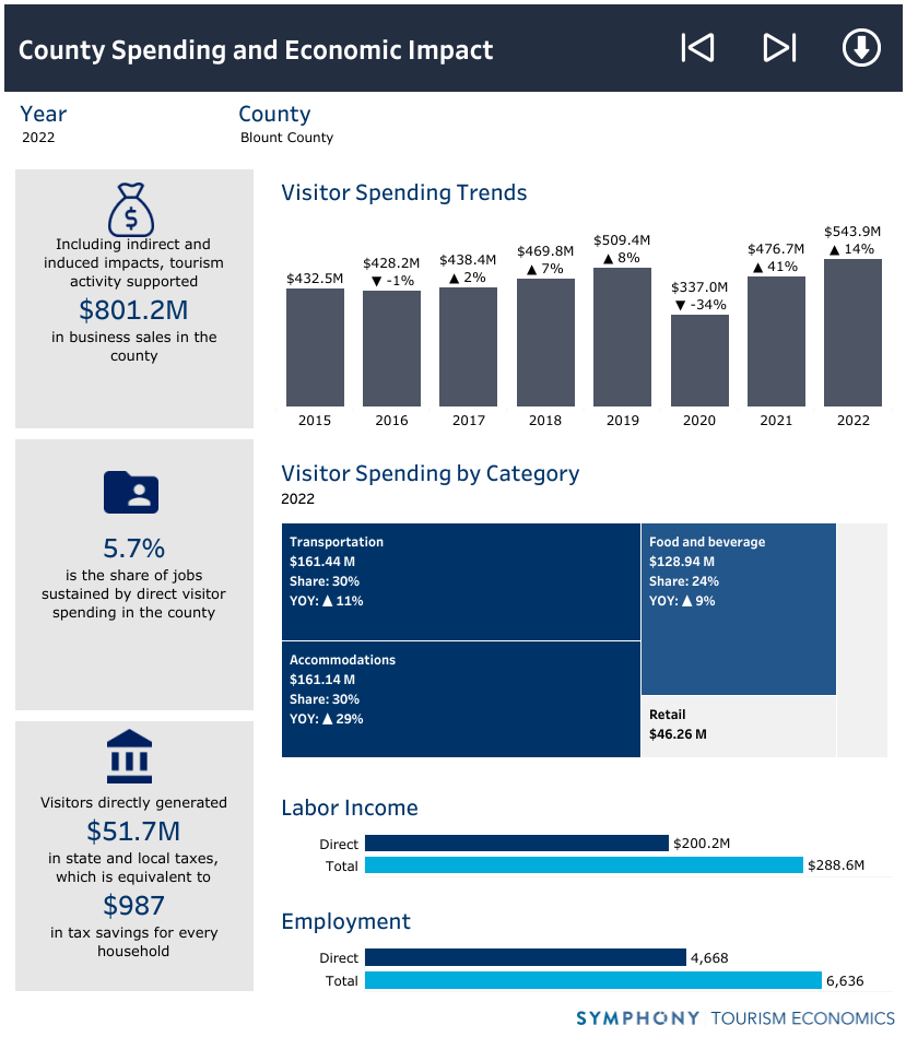 Visitor spending in Blount County generated $51.7 million in state and local tax revenue meaning that each household in the county saw a $987 annual tax savings. That is up from $700 the previous year.